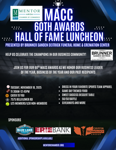 You’re Invited to the Mentor Chamber 60th Awards Hall of Fame Luncheon Presented by Brunner Sanden Deitrick Funeral Home & Cremation Center! Join us as we honor our Business Leader of the Year, Our Business of the Year and recognize our past award recipients.