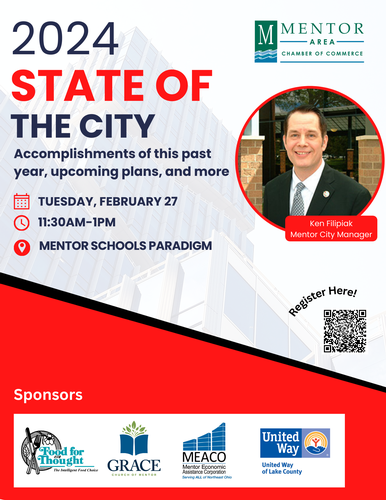 Join us for our Annual State of the City Luncheon when City of Mentor City Manager Ken Filipiak speaks to us about the past year and upcoming plans for the future.
