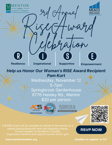 Join us in collaboration with MEACO/City of Mentor on Wednesday, November 11th for an inspiring evening as we honor our 2026 Woman's RISE Award Recipient.